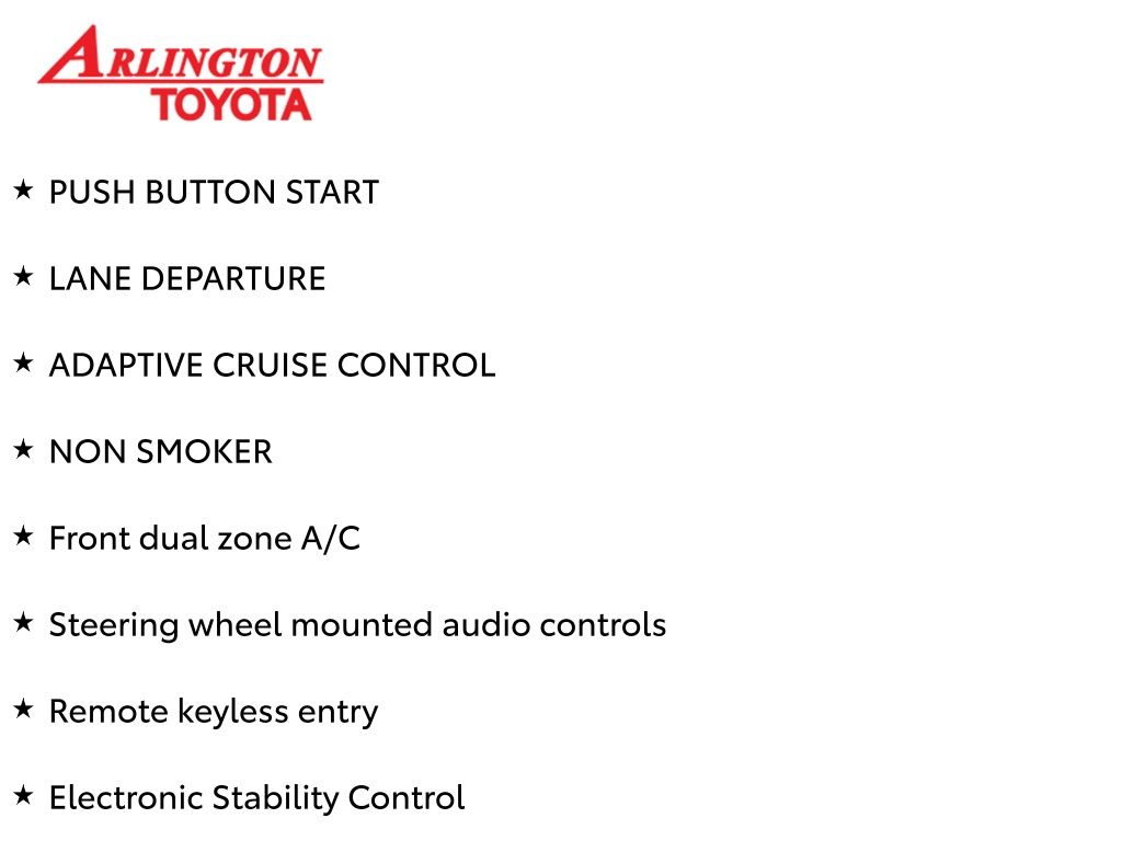 Prices do not include tax, tag, title, a pre-delivery service fee* of $894.00, an electronic registration filing fee* of $199.00 (*these charges represent costs and profits to the dealer for items such as inspecting, cleaning, and preparing documents related to the sale), and an Arlington Toyota Total Value Package of $1,889.00 (*these charges represent costs and profits to the dealer for items such as inspecting, cleaning, and preparing documents related to the sale). The final price is also subject to repair order reconditioning costs. Any price does not include dealer-installed accessories. All offers are mutually exclusive. All vehicles are subject to prior sale. See dealer for complete details.