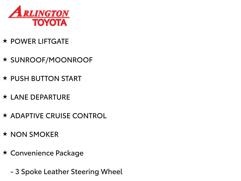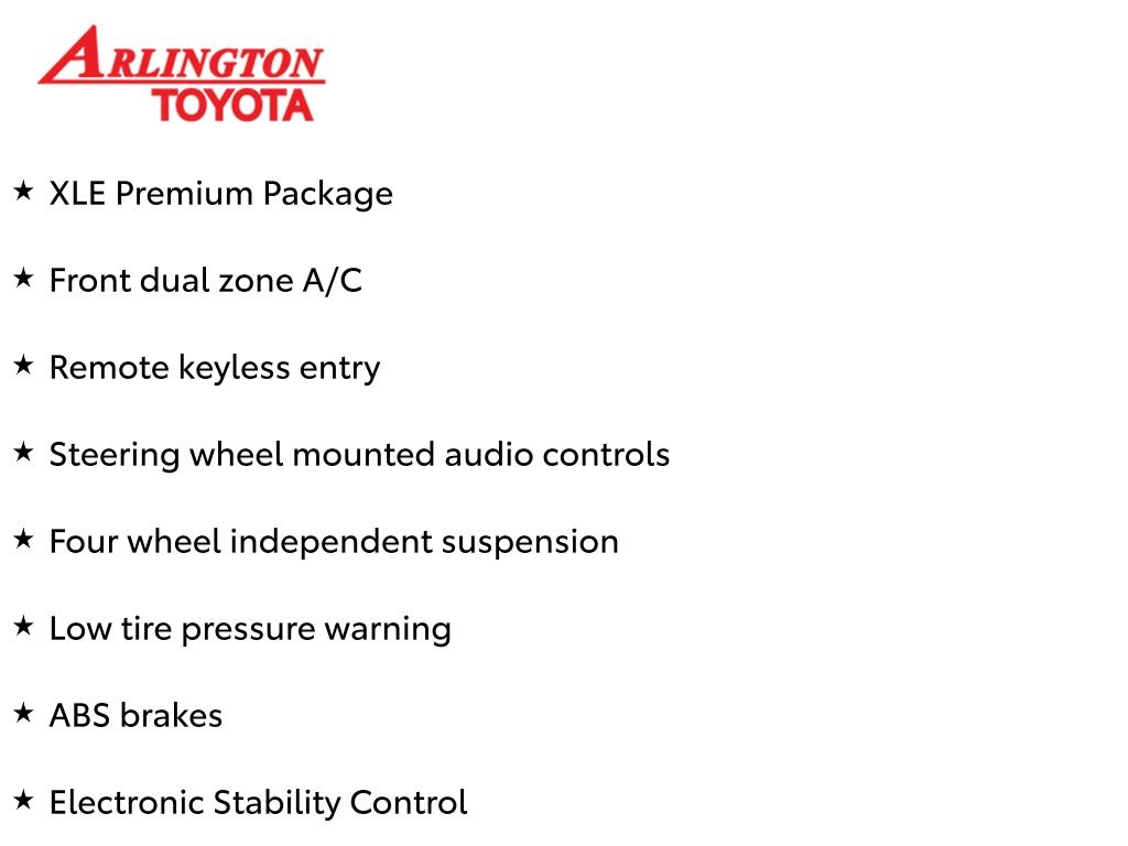 Prices do not include tax, tag, title, a pre-delivery service fee* of $894.00, an electronic registration filing fee* of $199.00 (*these charges represent costs and profits to the dealer for items such as inspecting, cleaning, and preparing documents related to the sale), and an Arlington Toyota Total Value Package of $1,889.00 (*these charges represent costs and profits to the dealer for items such as inspecting, cleaning, and preparing documents related to the sale). The final price is also subject to repair order reconditioning costs. Any price does not include dealer-installed accessories. All offers are mutually exclusive. All vehicles are subject to prior sale. See dealer for complete details.