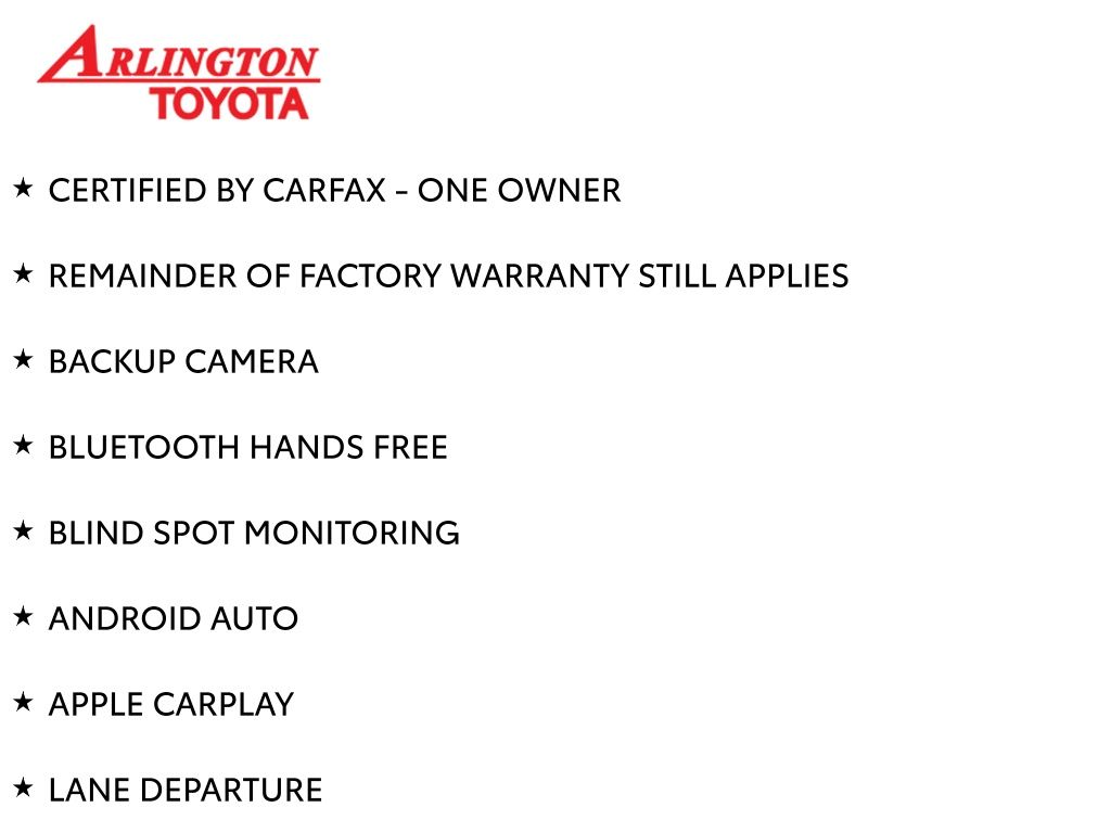 Prices do not include tax, tag, title, a pre-delivery service fee* of $894.00, an electronic registration filing fee* of $199.00 (*these charges represent costs and profits to the dealer for items such as inspecting, cleaning, and preparing documents related to the sale), and an Arlington Toyota Total Value Package of $1,889.00 (*these charges represent costs and profits to the dealer for items such as inspecting, cleaning, and preparing documents related to the sale). The final price is also subject to repair order reconditioning costs. Any price does not include dealer-installed accessories. All offers are mutually exclusive. All vehicles are subject to prior sale. See dealer for complete details.