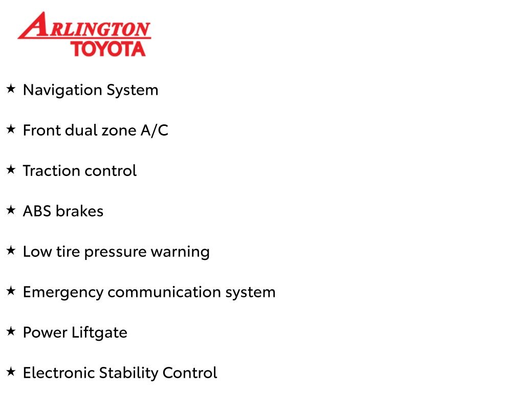 ABS brakes, Active Cruise Control, Alloy wheels, Compass, Electronic Stability Control, Emergency communication system, Front dual zone A/C, Heated door mirrors, Heated front seats, Heated rear seats, Illuminated entry, Low tire pressure warning, Navigation System, Power Liftgate, Traction control.