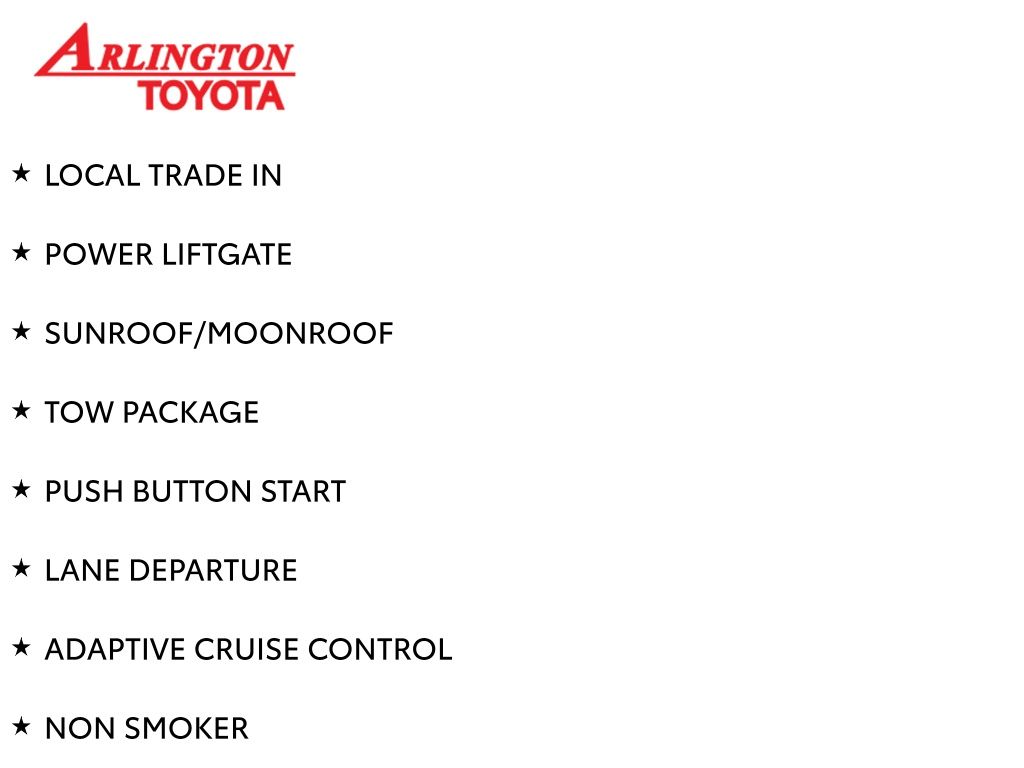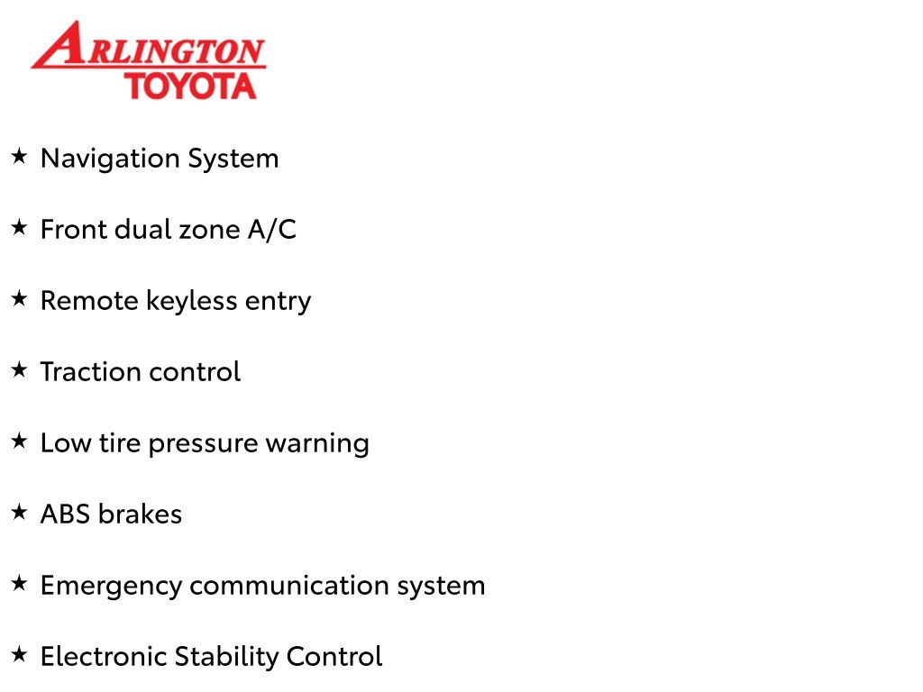 Prices do not include tax, tag, title, a pre-delivery service fee* of $894.00, an electronic registration filing fee* of $199.00 (*these charges represent costs and profits to the dealer for items such as inspecting, cleaning, and preparing documents related to the sale), and an Arlington Toyota Total Value Package of $1,889.00 (*these charges represent costs and profits to the dealer for items such as inspecting, cleaning, and preparing documents related to the sale). The final price is also subject to repair order reconditioning costs. Any price does not include dealer-installed accessories. All offers are mutually exclusive. All vehicles are subject to prior sale. See dealer for complete details.