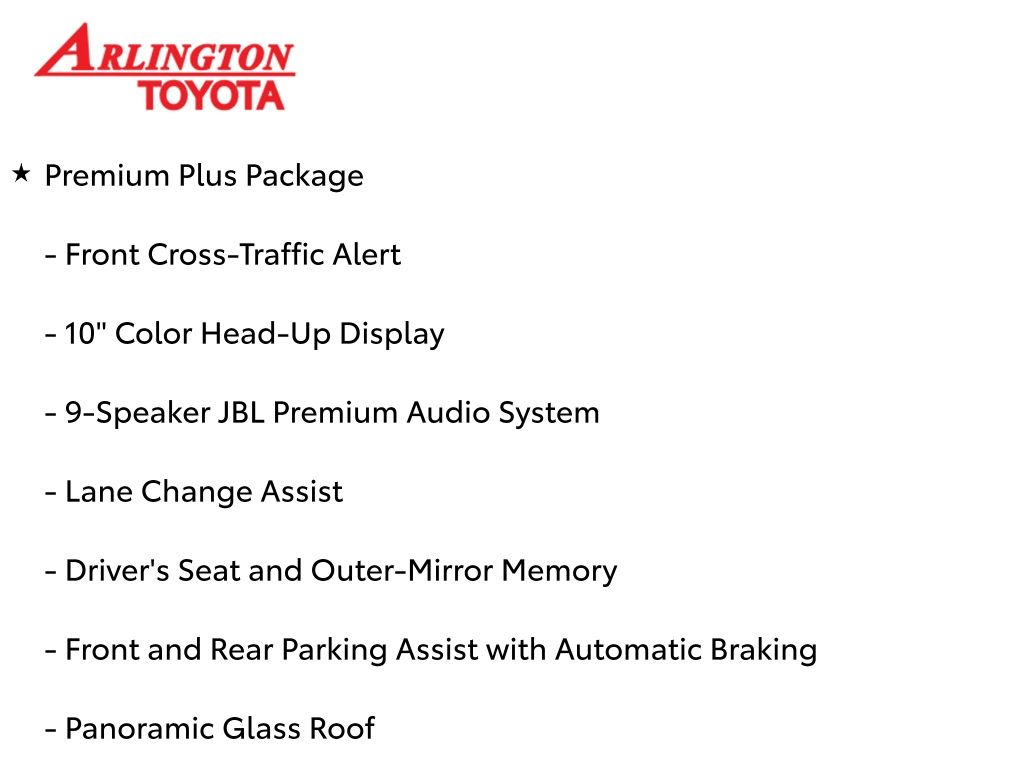 Premium Plus Package: Includes Traffic Jam Assist (req. Drive Connect Trial/Subscription; 1yr Trial Incl.), Front Cross-Traffic Alert, Lane Change Assist, Panoramic View Monitor, Front and Rear Parking Assist w/Automatic Braking, Rear Cross-Traffic Braking, 9-Speaker JBL Premium Audio System, Ventilated Front Seats, 10-in. Head-Up Display, Digital Key Capability (req. Remote Connect Trial/ Subscription; 1yr Trial Incl.) and Panoramic Glass Roof w/Front Power Tilt/ Slide Moonroof, Rain-Sensing Windshield Wipers, Driver's Seat And Outer-Mirror Memory