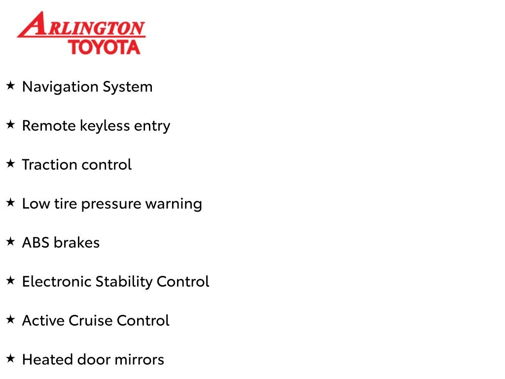 ABS brakes, Active Cruise Control, Alloy wheels, Electronic Stability Control, Heated door mirrors, Illuminated entry, Low tire pressure warning, Navigation System, Remote keyless entry, Traction control.
