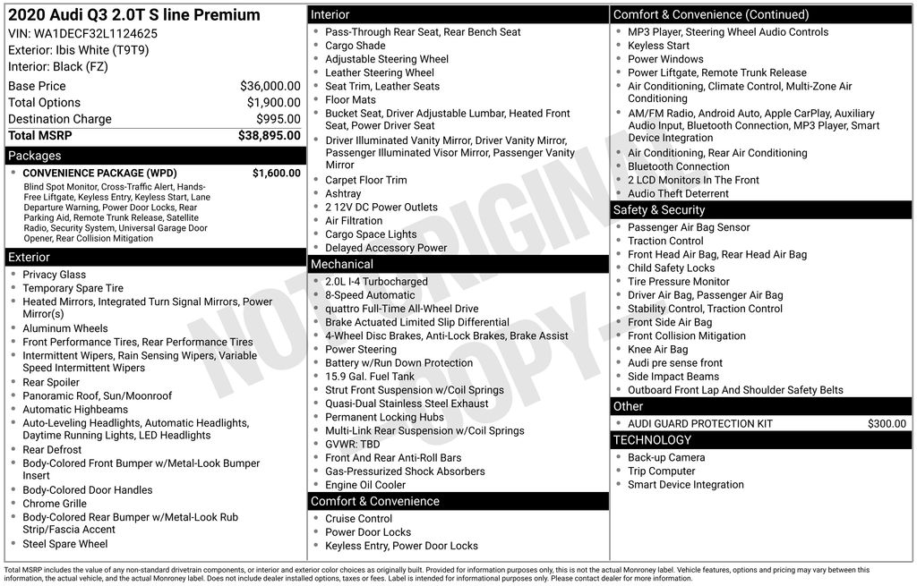 BACKUP CAMERA, BLUETOOTH HANDS FREE, 4X4/FOUR WHEEL DRIVE, LOCAL TRADE IN, PANORAMIC MOONROOF, POWER LIFTGATE, PUSH BUTTON START, CRUISE CONTROL, NON SMOKER, Q3 Premium quattro, 4D Sport Utility, 2.0L 4-Cylinder TFSI, 8-Speed Automatic with Tiptronic, quattro, Ibis White, Black Leather, ABS brakes, Alarm w/Motion Sensor, Audi Advanced Key, Audi Parking System Plus, Audi Side Assist, Convenience Package, Electronic Stability Control, Front dual zone A/C, Fully automatic headlights, HomeLink Garage Door Opener, Low tire pressure warning, Remote keyless entry, SiriusXM All Access Service, Steering wheel mounted audio controls, Turn signal indicator mirrors, 10 Speakers, 3.533 Axle Ratio, 4-Wheel Disc Brakes, Air Conditioning, Alloy wheels, AM/FM radio, Audi Guard Protection Kit, Audi smartphone interface (Apple CarPlay/Android Auto), Auto High-beam Headlights, Automatic temperature control, Brake assist, Bumpers: body-color, Delay-off headlights, Driver door bin, Driver vanity mirror, Dual front impact airbags, Dual front side impact airbags, Exterior Parking Camera Rear, Four wheel independent suspension, Front anti-roll bar, Front Bucket Seats, Front Center Armrest, Front fog lights, Front reading lights, Heated door mirrors, Heated Front Bucket Seats, Heated front seats, Illuminated entry, Knee airbag, Leather Seating Surfaces, Leather Shift Knob, Leather steering wheel, Occupant sensing airbag, Outside temperature display, Overhead airbag, Overhead console, Panic alarm, Passenger door bin, Passenger vanity mirror, Power door mirrors, Power driver seat, Power Liftgate, Power moonroof, Power steering, Power windows, Radio data system, Radio: Audi Sound System, Rain sensing wipers, Rear air conditioning, Rear anti-roll bar, Rear fog lights, Rear reading lights, Rear seat center armrest, Rear window defroster, Rear window wiper, Speed control, Speed-sensing steering, Split folding rear seat, Spoiler, Tachometer, Telescoping steering wheel, Tilt steering wheel, Traction control, Trip computer, Variably intermittent wipers, Wheels: 19" 5-Twin-Spoke Dynamic Design, Q3 Premium quattro, 4D Sport Utility, 2.0L 4-Cylinder TFSI, 8-Speed Automatic with Tiptronic, quattro, Ibis White, Black Leather, ABS brakes, Alarm w/Motion Sensor, Audi Advanced Key, Audi Parking System Plus, Audi Side Assist, Convenience Package, Electronic Stability Control, Front dual zone A/C, Fully automatic headlights, HomeLink Garage Door Opener, Low tire pressure warning, Remote keyless entry, SiriusXM All Access Service, Steering wheel mounted audio controls, Turn signal indicator mirrors.